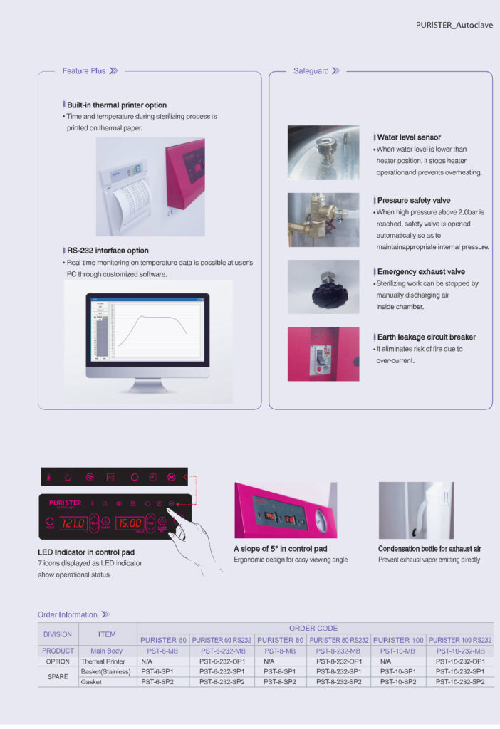 6. สามารถปรับช่วงอุณหภูมิได้ จากอุณหภูมิห้อง ถึง 131ᵒC ค่าความแม่นยำ (accuracy) ±1ᵒC ที่ 121ᵒC มี sensor ชนิด PT100Ω